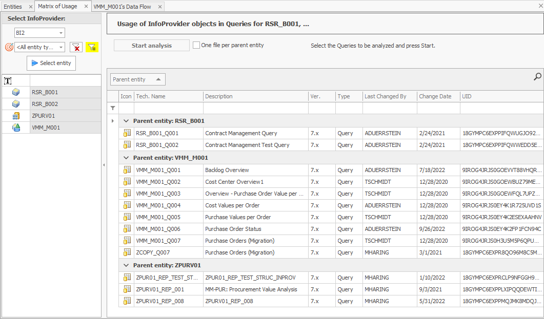 It is also possible to generate the usage matrix for several entities at once, even with different entity types.