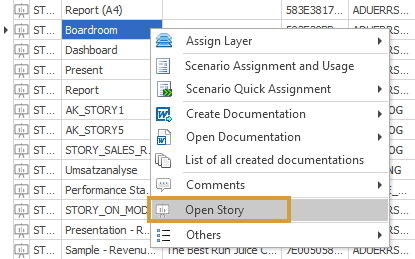 Via the context menu and the entry "Open Story" a SAC object can be opened in the SAC itself in the browser: