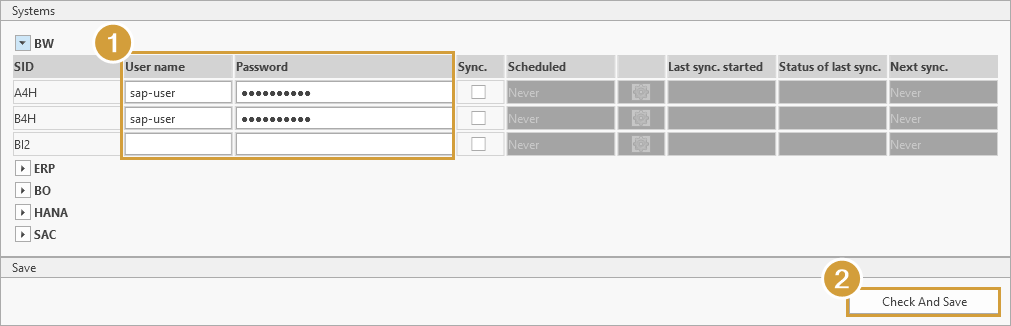"Check and Save" runs a check, if the SAP-User and PW is correct and saves the entered credentials (green = connection successful / red = connection failed)