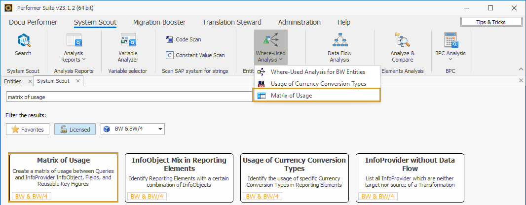 The function "Matrix of Usage" can be found in the Where-Used Analysis, in the context menu of an object (of a supported entity type) and via Search: