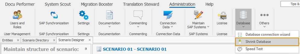 The database engine will reuse space effectively, but there are times when a database no longer needs to be as large as it once was; a frequent shrink of the database is necessary. Shrinking a database reduces the size of database data and log files and thereby improves the performance of the application. It is recommended to shrink the database every 14 days. If you are using an SQLite database that is stored on your local PC you can use the Performer Suite's built-in shrink functionality. The shrink can be started from the "Administration" menu in the section "Database":